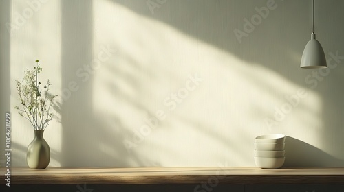 A vase sits on a table beside a flower-filled vase Light illuminates the wall behind it