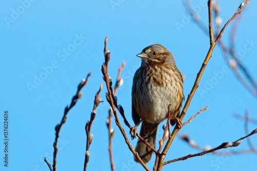 animal, avian, background, beak, beautiful, beauty, bird, birding, birding, tree branch, brown, closeup, cute, environment, eye, fauna, feather, feather, grey, habitat, washington, natural, nature, ornithology, outdoors, passeriformes, passerine, perch, perched, plumage, sitting, sky, small, song, songbird, sparrow, spring, stripes, tree, twig, wild, wildlife