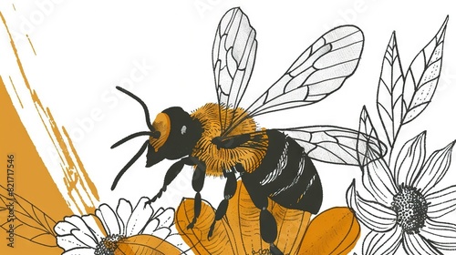 Drawing of a bee on yellow-white background among daisies with grungy edges
