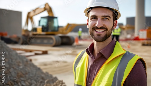 a beautiful smiling young engineer in front of a blurry construction background generative ai