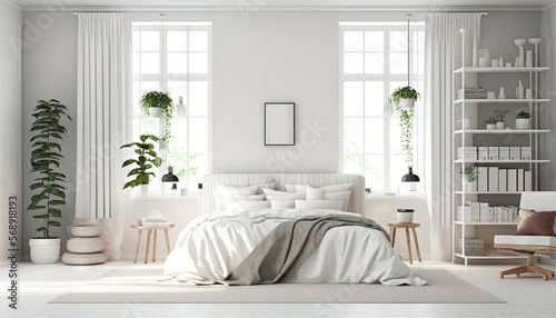 a bedroom with a bed, a chair, and two windows with plants on them in the corner of the room, and a white rug on the floor. generative ai