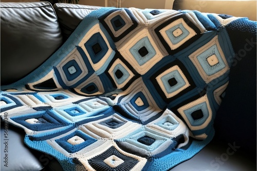 a blue and white blanket sitting on top of a couch next to a black leather chair and a window with a curtain in it and a black leather chair with a blue cushion and white. Generative AI