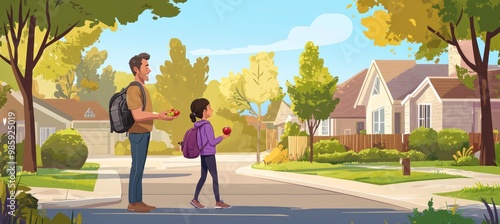 A father stands in the middle of his driveway, holding out an apple to his daughter as she walks towards him . The background is a suburban neighborhood with trees and houses in a flat cartoon style.