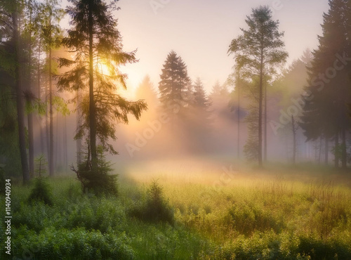 fog, morning, forest, clearing, mist, aethereal, mystical, soft light, dreamy, green tree, calmness, peaceful, serene, nature, quiet, outdoors, mystery, timberland, stillness, solitude, atmospheric, calm, fresh air, early morning, natural beauty, silence, dreamlike