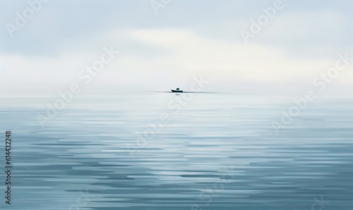 a small boat floating in the middle of the ocean on a foggy day with a boat in the distance in the distance is a distant horizon. generative ai
