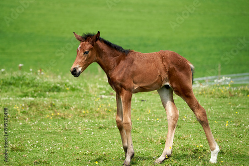Brown Foal Gamboling Amongst Blossoming Wildflowers in Summer Pasture, Lørenskog, Norway