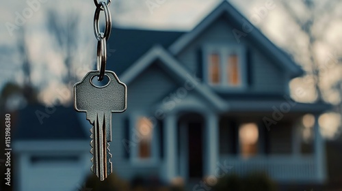 Close-up of house keys hanging from a key ring in front of a suburban home