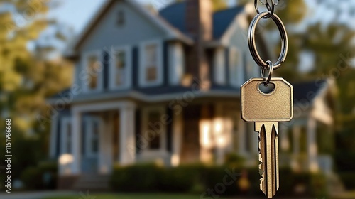 Close-up of house keys hanging from a key ring in front of a suburban home