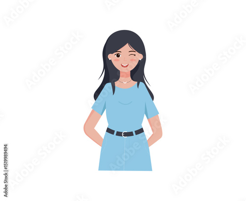 piercing, woman, fashion, beauty, dress, model, person, standing, people, smile, body, teenage, posing, hair, slim, smiling, 1, brunette, studio, isolated, heel, full, leg, lifestyle, glamour, skirt, earring, children, cartoon, children, face, fun, hat, black, expression, blue, shirt, vector, illustration, long hair