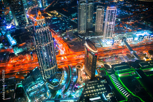 Dubai city at night, view with lit up skyscrapers and roads. Dubai, UAE 2022