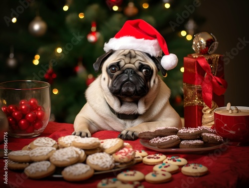 pug, christmas, treat, holiday, hat, delicacy, new year, animal, pet, gift, decoration, cookie, candle, dessert, festive, table, cake, winter, atmosphere, cosiness, animal, dog, pet, biscuit, mood, cupcake, cosy, joy, dog, christmas, portrait, studio