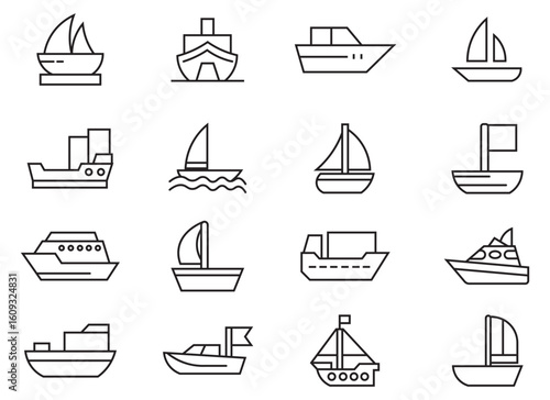 Sailboat thin line vector icon set. Contains as creatures, sailing, ship, anchor, compass, underwater exploration, sailboat, coral reef liner illustration. Small and large seagoing vessels.