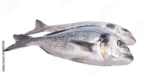 Two uncooked fishes over white isolated background