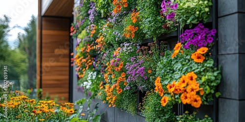 Vertical garden with vibrant orange, purple, and green flowers decorating a modern wall, creating a stunning display of nature’s beauty in an urban environment.