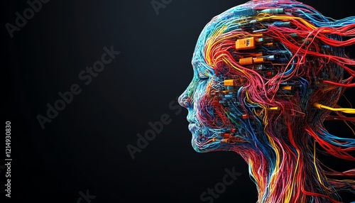 3D abstract head and brain illustration formed by USB cables, symbolizing power and anxiety, with mockup space on a wide black background