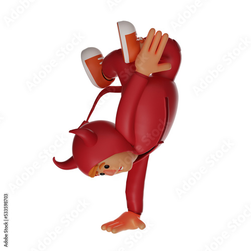 3D illustration. 3D Cartoon Funny Face Red Devil standing with one hand. with the body upside down. both feet facing up. 3D Cartoon Character
