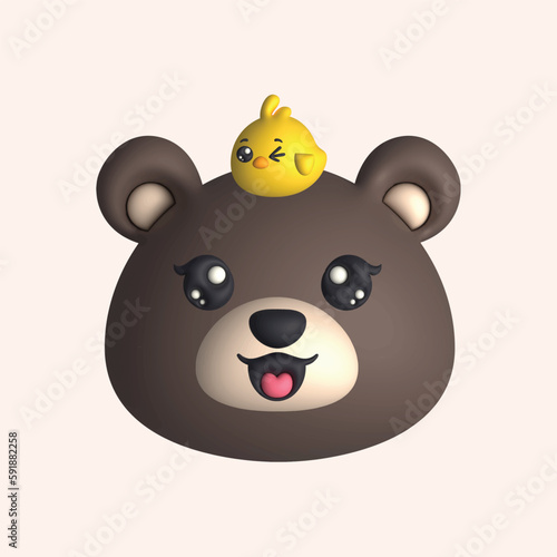 3D Render Happy Cute Bear Head with Chick (Vector)