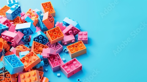 3d rendering of colorful construction equipment scattered on light blue background. Pile or pileup of plastic building blocks with orange and pink cubes. Isolated flat lay with copy space. Background