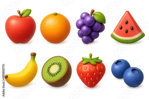 fruit, three-dimensional, icon, colourful, simple, vibrant, style, apple, orange, grape, watermelon, banana, kiwi, strawberry, blueberry, design, bright, food, fresh, creative, juicy, visual, modern, digital, collection, set, artistic, decoration, cartoony, playful, symbolic, assortment, lively, glossy, aesthetic, appealing, texture, editable, element, graphic, theme, fun, charming, sweet, polished, trendy, adorable