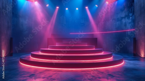 3D stage podium with editable branding elements and dynamic spotlight controls. , Minimalism,