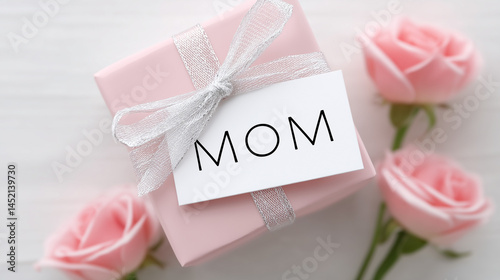 3w Elegant flat lay of Mother’s Day gift box, greeting card, and blooming roses