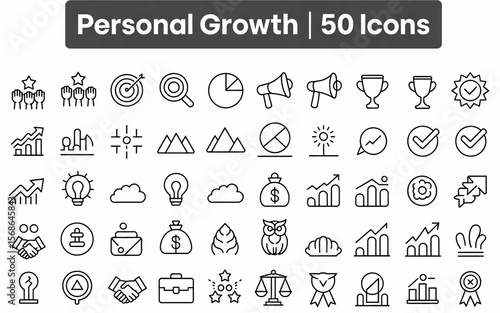 50 clean black-and-white line icons on personal growth, neatly arranged in grid, labeled “PERSONAL GROWTH 50 ICONS” above