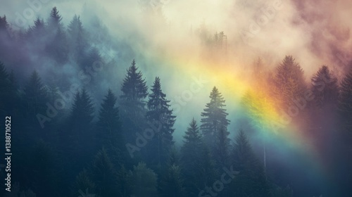 tranquil, image, forest, covered, mist, rainbow, emerging, fog, creating, peaceful, harmonious, scene, calming, beauty, nature, after, rain, shower