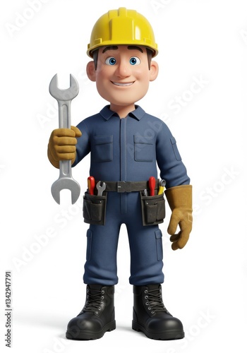 A 3D character mechanic in a yellow hard hat, holding a wrench, with a tool belt and gloves, smiling confidently 01