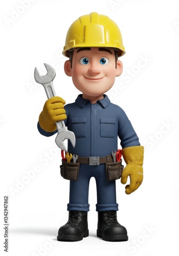 A 3D character mechanic in a yellow hard hat, holding a wrench, with a tool belt and gloves, smiling confidently 03