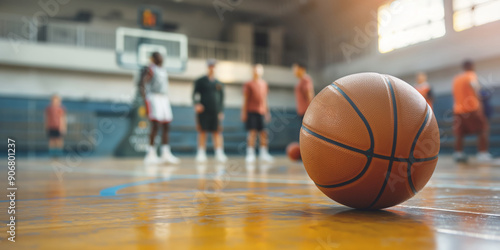 A basketball is sitting on the floor in a gym. There are several people in the background, some of them are standing and others are sitting