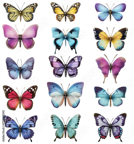 butterfly, butterfly, insect, insect, moth, animal, wildlife, creature, entomology, lepidoptera, colourful, vibrant, beautiful, delicate, elegant, graceful, pretty, artistic, illustration, drawing, painting, watercolor, set, collection, variety, assortment, design, element, graphic, icon, symbol, blue, pink, purple, yellow, red, green, orange, turquoise, magenta, violet, many-coloured, iridescent, wing, wing, antennae, pattern, isolated, white