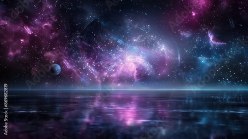 A beautiful, colorful, and starry night sky with a large planet in the foreground. The sky is filled with stars and the water is calm and reflective