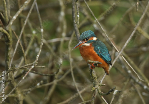 A beautiful hunting Kingfisher, Alcedo atthis, perching on a twig that is growing over a river. It has been diving into the water catching fish to eat.