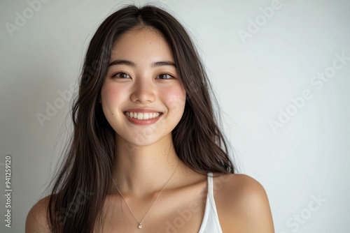 A beautiful Japanese woman with long flowing hair smiles radiantly in a white sleeveless top. The simplicity of the outfit and her joyful expression make.