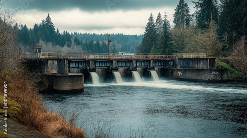 A beautiful, serene landscape featuring a hydroelectric dam, harnessing water flow to generate renewable energy.
