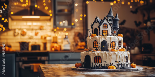 A beautifully decorated Halloween cake shaped like a haunted house with pumpkins and spooky elements. The cake sits in a cozy kitchen with bokeh lights in the background, creating a festive scene.