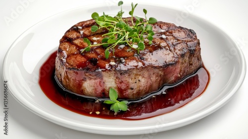 A beautifully plated steak with a glossy red wine reduction sauce, garnished with microgreens.