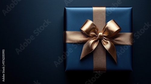 A beautifully wrapped blue gift box with a golden ribbon and bow, perfect for celebrations.