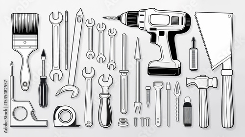 A black and white line art illustration of various DIY and repair tools arranged on a white background