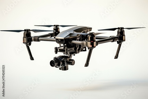 A black drone flying with a camera attached. Suitable for technology concepts