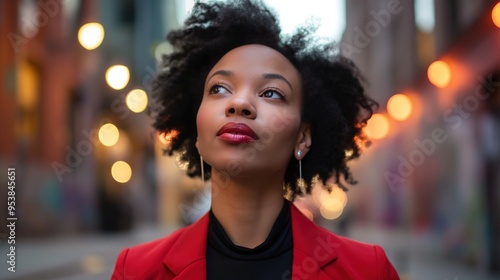 black woman, portrait, individual, urban, city, twilight, confidence, street, thinker, evening, lifestyle, beauty, fashion, red jacket, self-assured, bokeh, light, thoughtful, peaceful, admiration, serenity, diversity, woman, candid, contemplation, modern, vibrant, character, personality, expression, exploration, aspiration, travel, hanging out, city landscape, emotion, youthful