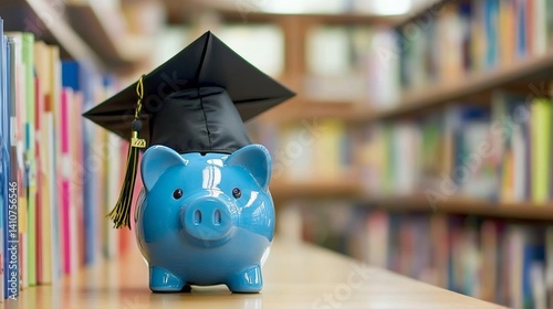 A blue piggy bank with a graduation cap symbolizes educational savings and future ambitions on a clean, white background.