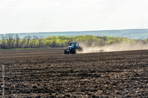 A blue tractor works on a field on a spring morning.