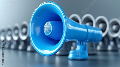 A bold blue megaphone standing out from a crowd of gray ones, symbolizing success, leadership, and the power to be heard in a competitive environment.