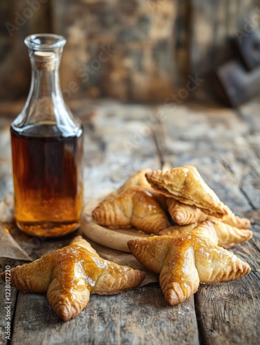 A bottle of syrup sits next to a plate of pastries. The pastries are star-shaped and appear to be sweet. Concept of indulgence and enjoyment, as the syrup