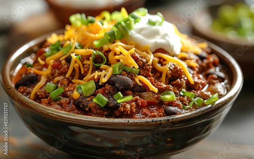 chili, bowl, cheese, sour, cream, green, onion, beef, bean, tomatoes, powder, cumin, garlic, onion, pepper, spice, food, dinner, meal, comfort, warm, spicey, savoury, hearty, delicious, homemade, fresh, close, photo, receipe, cookery, cooking, kitchen, eating, dining, hunger, craving, flavorful, snack, side, dish, stew, broth, meat, vegetable, kitchen utensile, brown