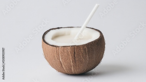 A bowl of coconut milk with a straw in it