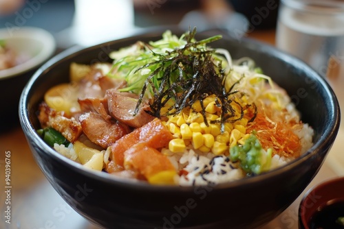 A Bowl of Japanese Rice with Meat, Corn, and Seaweed
