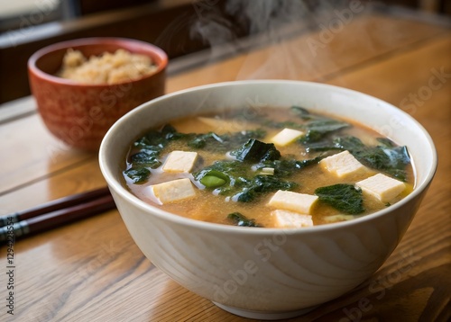 A bowl of miso soup with tofu and greens, accompanied by a bowl of rice, all placed on a wooden surface with chopsticks beside it. The background is slightly blurred, emphasizing the bowl and its cont