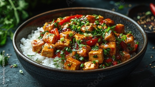 rice, tofu, vegetable, stir fry, bowl, meal, dinner, cookery, herb, garnish, favor, dish, ingredient, cooking, asian, spicey, savoury, healthy, colourful, fresh, protein, pepper, onion, garlic, soy, sauce, cilantro, green, red, aromatic, kitchen, culinary, receipe, comfort, nourishment, serving, plate, homemade, delicious, vegetarian, appetising, chopstick, dining, cultural, warm, satisfying, wholesome